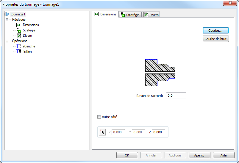 Utilisez l'onglet Dimensions pour éditer les dimensions de la feature de tournage.