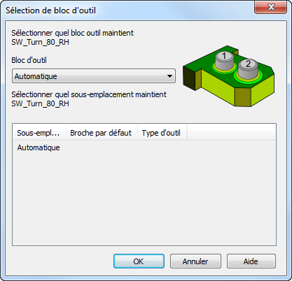 Utilisez la boite de dialogue Sélection de bloc d'outil pour spécifier quel bloc d'outil maintient quel outil.