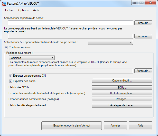 Les propriétés de repère exportées seront basées sur le template VERICUT — Pour spécifier un template Vericut séparément pour chaque repère, cliquez sur Parcourir et sélectionnez un fichier template pour le repère sélectionné. Vous pouvez utiliser ceci si vous utilisez une machine différente pour chaque repère. Cela n'affecte pas les réglages globaux du projet.