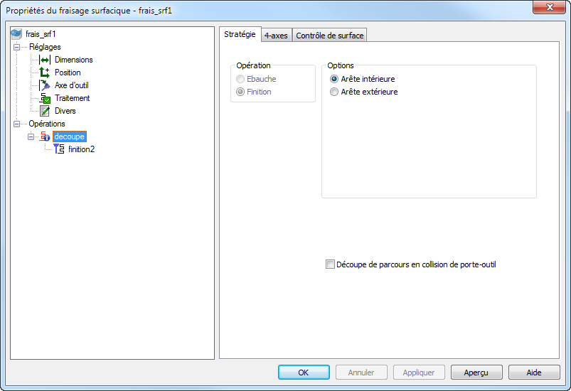Découpe de parcours en collision de porte-outil — Recoupe le parcours d'outils où le porte-outil ou le corps entre en collision avec la surface de pièce ou avec la surface de garde, ou le brut non-usiné. Quand sélectionné, les attributs Garde de porte-outil et Garde de corps sont affichés dans l'onglet Fraisage pour l'opération.