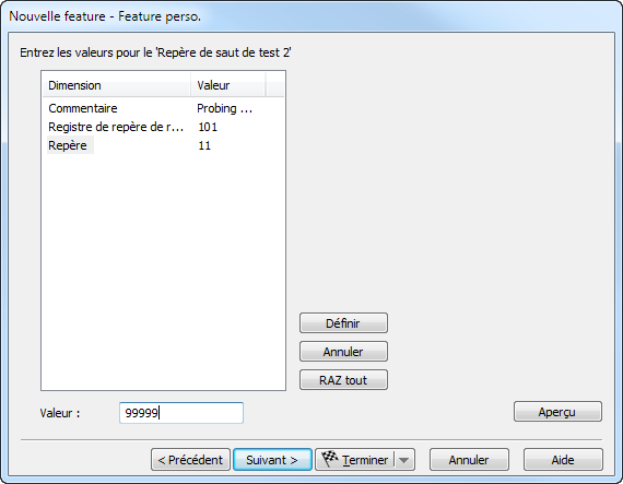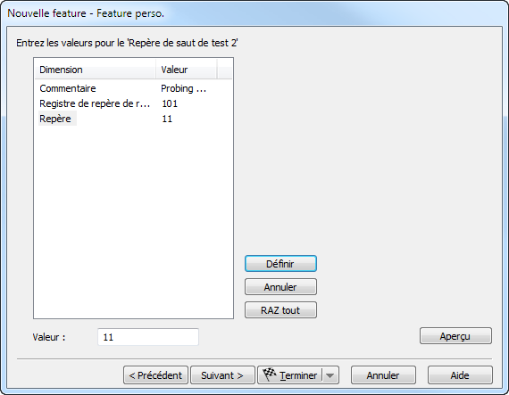 Repère de réusinage 11 (la valeur qui a été définie pour le repère de saut de test de départ)
