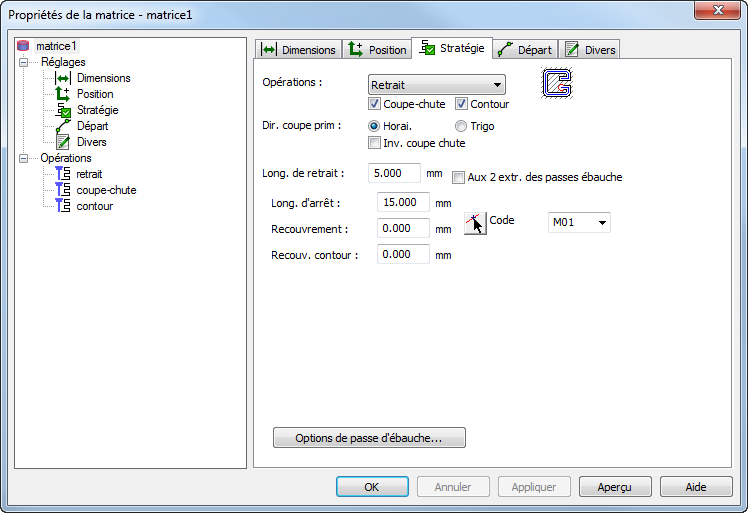 Recouvrement — Entrez la distance à laquelle la position finale du contour normal est recouverte pour les opérations de stop et de coupe-chute.