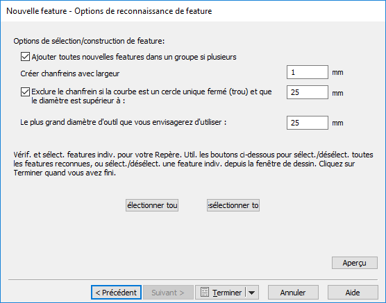 Dans FeatureCAM, vous pouvez créer des opérations de chanfrein/ébavurage, même quand le modèle ne contient pas ces chanfreins ou ces régions ébavurées.
