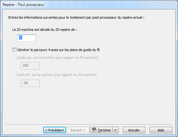 Pour ces machines, sélectionnez Générer le parcours 4-axes sur les plans de guide du fil et entrez les plans Z des guide supérieur et guide inférieur.