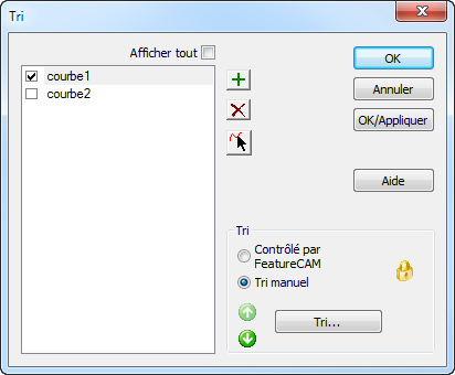 Pour afficher la boite de dialogue Tri, cliquez sur Courbes dans l'onglet Dimensions de la boite de dialogue de propriétés de feature de fraisage.