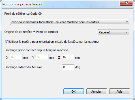 Vous pouvez utiliser la boite de dialogue Position de posage 5-axes pour spécifier un point de référence pour le code CN.