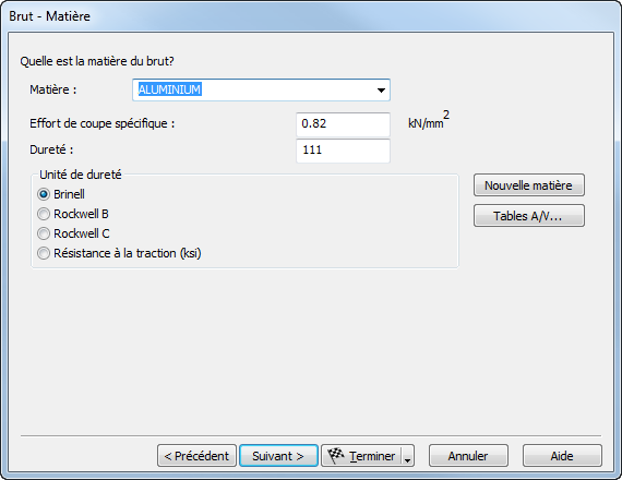 Cette boite de dialogue est utilisée pour choisir le type de matière appliquée au brut. Les utilisateurs confirmés peuvent aussi ajouter de nouvelles matières ou visualiser des tableaux d'avance/vitesse.