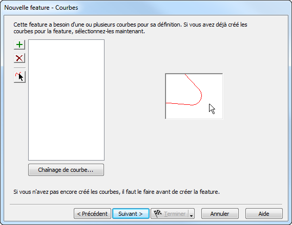 Si vous créez une feature depuis une courbe, la page suivante de l'assistant est la page Nouvelle feature - Courbes. Cette page vous sert à spécifier la courbe qui impose la forme de la feature. Cette page est la même pour toutes les features de type Depuis courbe.