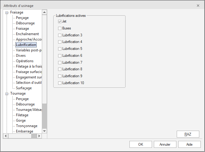 Sélectionnez le type de lubrification que vous voulez utiliser. Les types de lubrification disponibles sont spécifiés dans le fichier CNC en utilisant la boite de dialogue Lubrification de XBUILD.