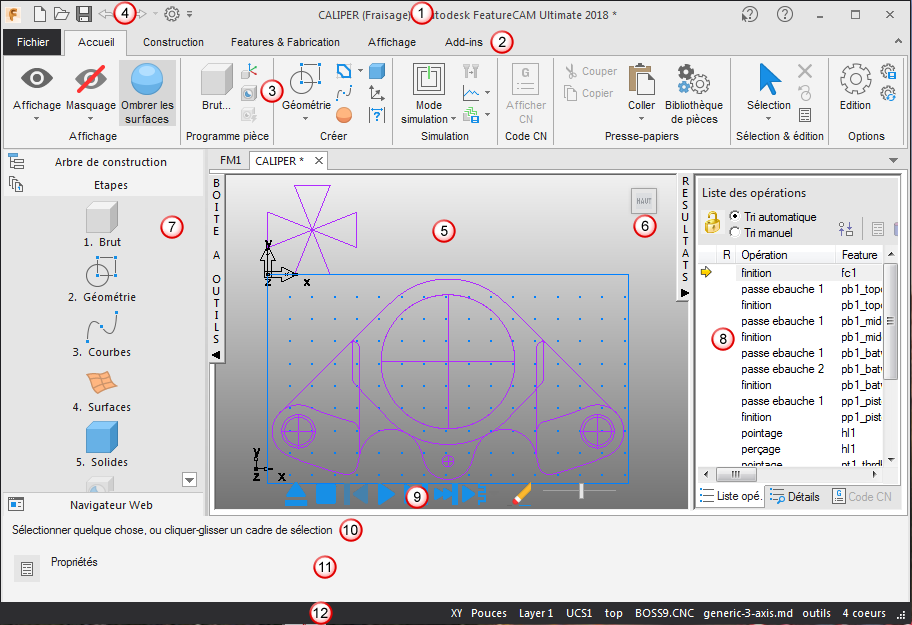 L'interface de FeatureCAM contient un nombre d'éléments traditionnels de Windows, tels que les barres d'outils, les boites de dialogue, les menus contextuels et les assistants.