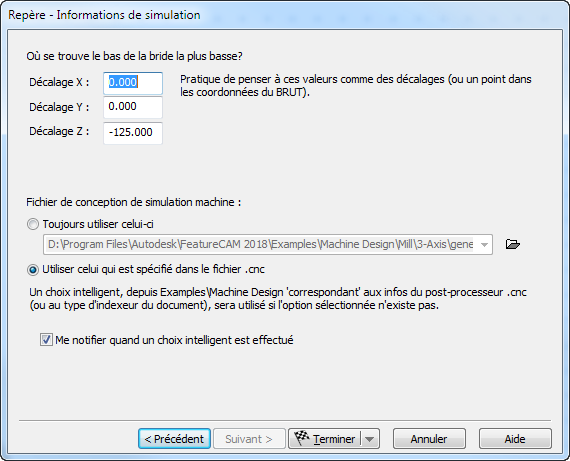 Si vous sélectionnez un fichier MD qui n'existe pas, ou que le fichier CNC se réfère à un fichier MD qui n'existe pas, FeatureCAM sélectionne un fichier MD approprié dans le dossier Examples\Machine Design. Si un choix intelligent est effectué, un message est affiché quand vous fermez la boite de dialogue et quand vous lancez une simulation. Vous pouvez désactiver ces messages en désélectionnant Me notifier quand un choix intelligent est effectué.