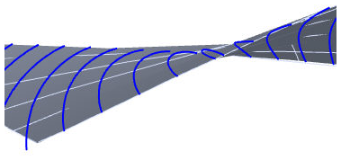 Bien que cela semble être une surface, réglée, développable, les isolignes sont incurvées. Cela peut engendrer des parcours étranges, parce que FeatureCAM essaie au mieux de garder la totalité de côté de l'outil en contact avec la surface, en d'autre termes, l'axe d'outil peut varier radicalement.