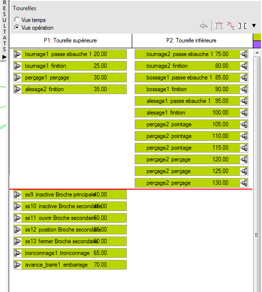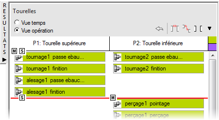 Les opérations sont affichées à côté des noms de feature dans les colonnes organisées par la tourelle et la broche.