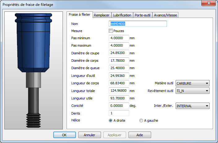 Hélice — Sélectionnez si l'outil est un outil à droite ou à gauche.