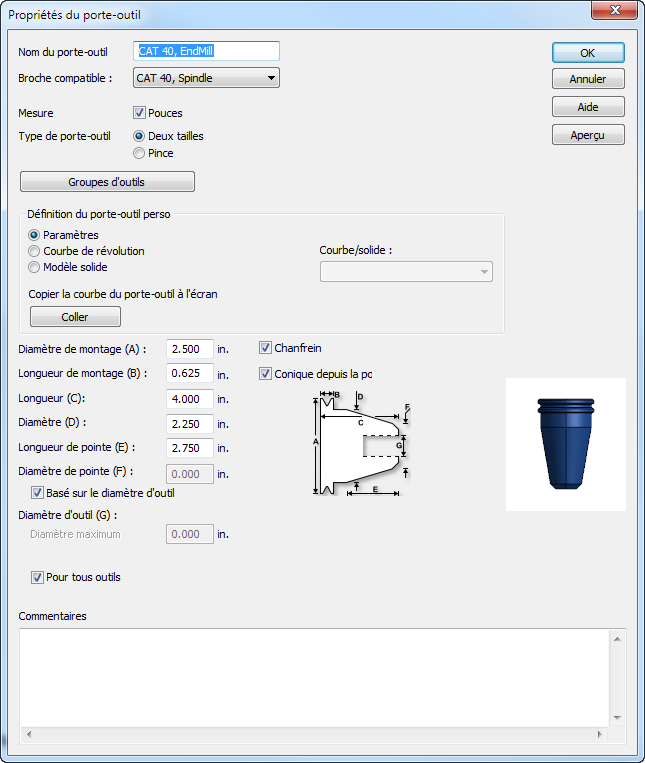 Pour afficher la boite de dialogue de propriétés de porte-outil, cliquez sur