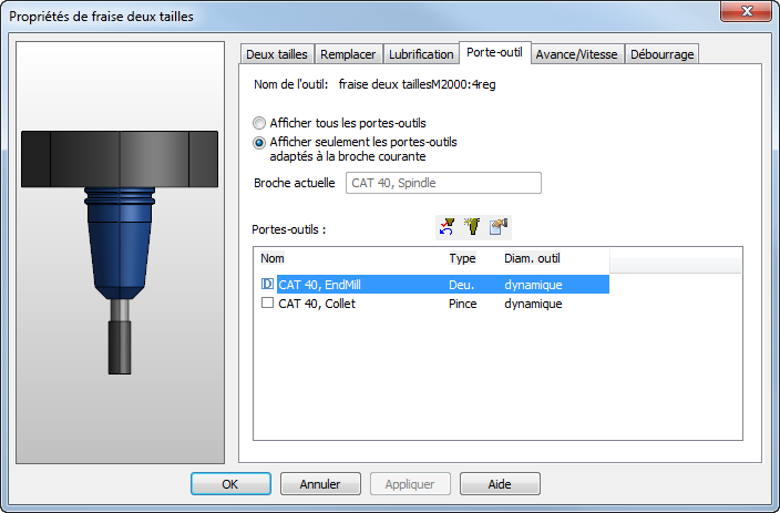 Sélectionnez Afficher seulement les portes-outils adaptés à la broche actuelle pour masquer les portes-outils qui ne correspondent pas à la broche actuelle. Sélectionnez Afficher tous les portes-outils pour tous les afficher.
