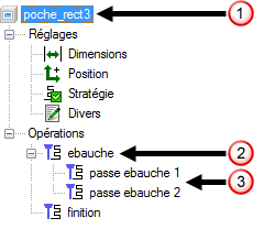 L'arborescence du fraisage 2,5D énumère les différentes opérations et passes pour la feature :