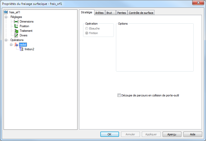 Découpe de parcours en collision de porte-outil — Recoupe le parcours d'outils où le porte-outil ou le corps entre en collision avec la surface de pièce ou avec la surface de garde, ou le brut non-usiné. Quand sélectionné, les attributs Garde de porte-outil et Garde de corps sont affichés dans l'onglet Fraisage pour l'opération.
