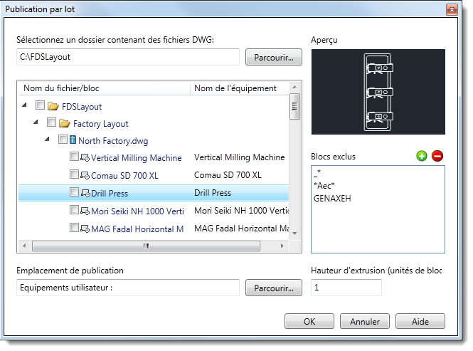 L'option Publication par lot vous permet de créer simultanément plusieurs équipements à partir de blocs contenus dans des fichiers DWG. Cette fonction s'avère utile si, actuellement, vous gérez des blocs en les regroupant dans des fichiers distincts et que vous souhaitez les convertir en équipements d'usine.