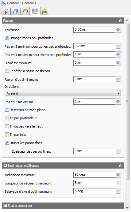 Dans le cadre des opérations de finition, la valeur par défaut est égale à 0 mm/0 po ; autrement dit, aucune quantité de matière n'est conservée.