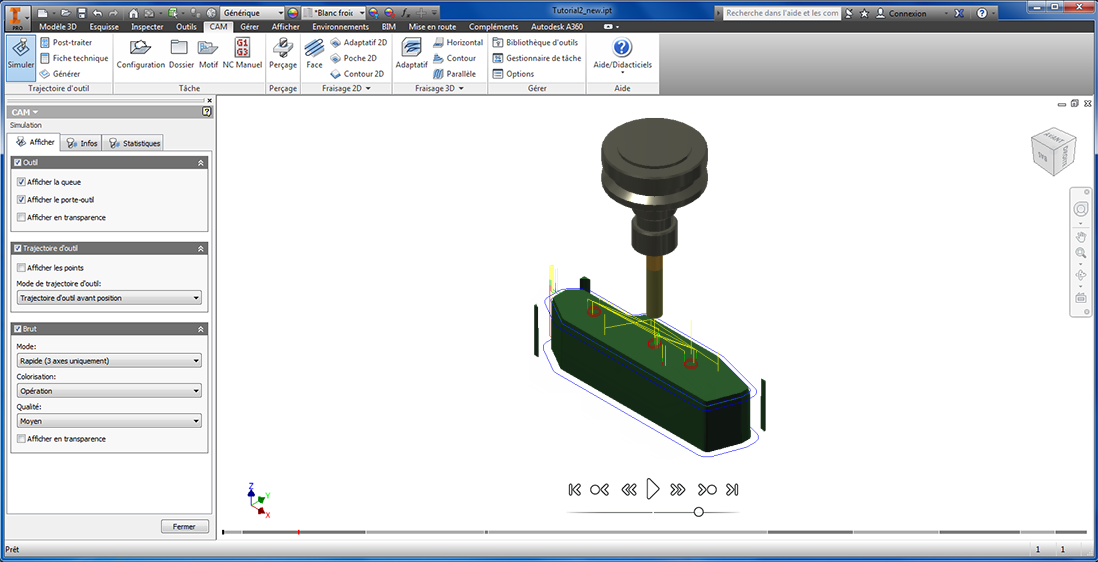 Après la génération d'une trajectoire d'outil, vous pouvez examiner le résultat à l'aide de l'outil de simulation intégré. A l'aide de la fonction Départ, le mouvement de l'outil est simulé. Les nombreuses commandes incluent la vitesse et le sens de la simulation, la visibilité de l'outil, de l'arbre et du porte-outil, ainsi que la coloration des mouvements rapides, des avancées et des mouvements de coupe.
