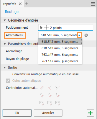 Une fois la géométrie terminale définie pour créer une zone de routage automatique, plusieurs solutions sont susceptibles d'être calculées selon la longueur et le nombre de segments. Pour afficher l’alternative disponible lors de la création du routage, cliquez sur la flèche déroulante Alternatives.