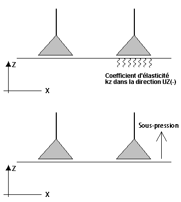 Lorsque vous définissez une sous-pression pour une contrainte (par exemple, une sous-pression basée sur l'orientation de l'axe Z, c'est-à-dire UZ+), vous pouvez également définir le coefficient de base élastique KZ pour chaque contrainte. Le coefficient d'élasticité est déterminé uniquement dans le sens opposé à celui défini pour la sous-pression antérieure (c'est-à-dire, UZ-). Consultez les images suivantes :