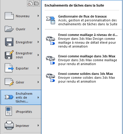 Un flux de travail applique des paramètres présélectionnés dans 3ds Max Design aux données de conception du produit source (AutoCAD, Inventor ou Revit). Plusieurs flux de travail sont disponibles pour chaque produit source et peuvent être optimisés pour des tâches spécifiques, telles que la création de rendus de qualité supérieure ou l'analyse de l'éclairage.
