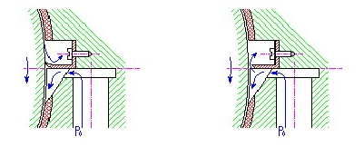 Si un système de lubrification avec recyclage est utilisé dans le roulement, une partie de l'huile ayant traversé la couche de lubrification à vide est renvoyée dans la couche de pression et continue de circuler. A cause du refroidissement de la lubrification, il est quelquefois conseillé d'utiliser un système de lubrification sans circulation, dans lequel l'huile traversant la couche est éliminée. Voir l'essuyage du lubrifiant sur le premier système et l'évacuation du lubrifiant sur le deuxième système :