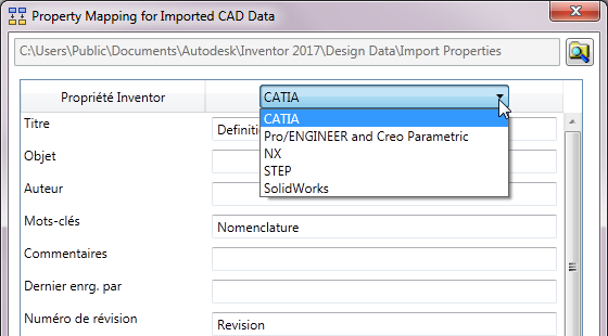 Mappez facilement des propriétés CATIA, Pro/Engineer et Creo Parametric, NX, STEP et SolidWorks aux propriétés Inventor standard grâce à l'outil de mappage des propriétés pour les données de CAO importées.