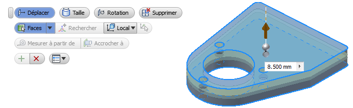 Modifiez des pièces rapidement grâce à la fonction de modification directe. Ajustez la taille, la forme et/ou l'emplacement de fonctions du modèle en manipulant directement la géométrie. Utilisez la fonction de modification directe pour :