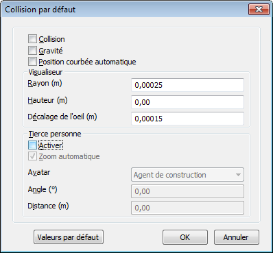 4. Dans la boîte de dialogue Collision par défaut, sélectionnez les options d'initialisation par défaut à appliquer à Autodesk Navisworks.