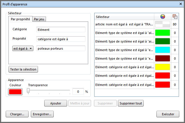 Les sélecteurs de profils d'apparence définissent les critères de sélection et les paramètres d'apparence des objets. La sélection d'objet peut être basée sur des valeurs de propriétés ou sur des jeux de sélection et de recherche disponibles dans votre fichier Autodesk Navisworks.