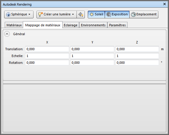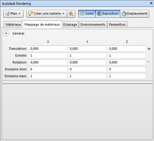 Le mappage de matériaux définit la façon dont une coordonnée 3D et une normale sont transformées en coordonnée de texte 2D (UV), qui permet de rechercher des couleurs, etc. à partir d'une correspondance de texture. Chaque mappage spécifique repose sur une "recette" différente. Les champs Translation, Echelle et Rotation, section Général, définissent une transformation appliquée à chaque coordonnée 3D et à chaque normale avant d'appliquer la recette pour chaque type de mappage qui transforme le point 3D en coordonnée de texture. Les valeurs des champs Domaine min et Domaine max sont utilisées dans de nombreuses recettes du mappage pour déterminer la plage (minimum-maximum) de l'espace de coordonnées (X, Y, Z) qui correspond à 0 à 1 dans l'espace de texture pour chaque coordonnée.