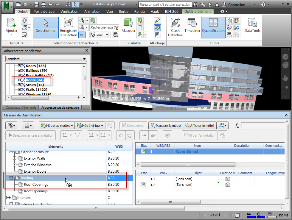 Le métré basé sur modèle utilise les propriétés intégrées dans les fichiers sources de conception pour créer les données de métré. Il extrait les objets du modèle et les affiche en tant qu'éléments dans le classeur de Quantification.