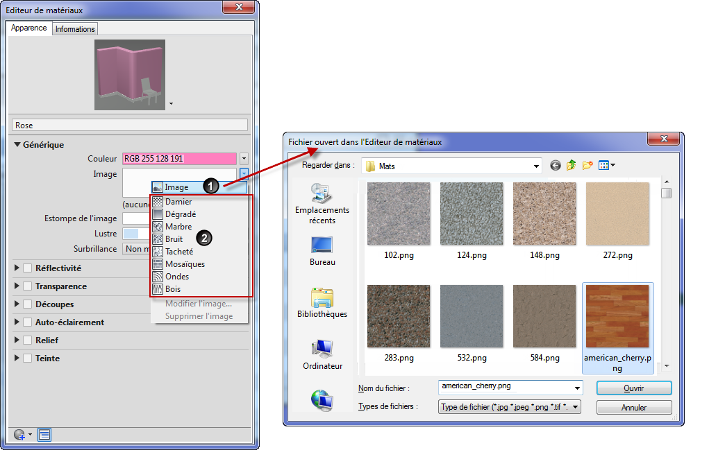 Vous pouvez affecter des textures à la couleur d'un matériau.