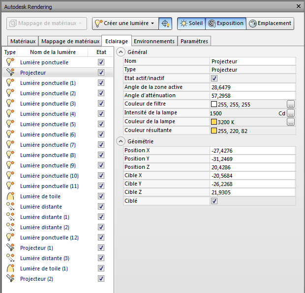 Chaque lumière que vous ajoutez au modèle s'affiche dans la vue par nom et par type. La case à cocher Etat permet d'activer et de désactiver les lumières. Un clic avec le bouton droit de la souris sur une lumière affiche le menu contextuel. Un clic sur une lumière sélectionne celle-ci et affiche ses propriétés dans la vue des propriétés. La lumière du soleil et celle du ciel ne sont pas incluses, mais vous pouvez ajuster leurs propriétés dans l'onglet Environnements.