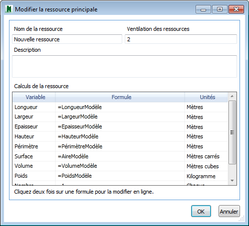Les ressources principales sont les valeurs associées aux ressources de base et d'origine de votre catalogue de projet. Vous pouvez les modifier dans le catalogue d'éléments. Toute modification que vous apportez n'est appliquée qu'aux nouvelles ressources.