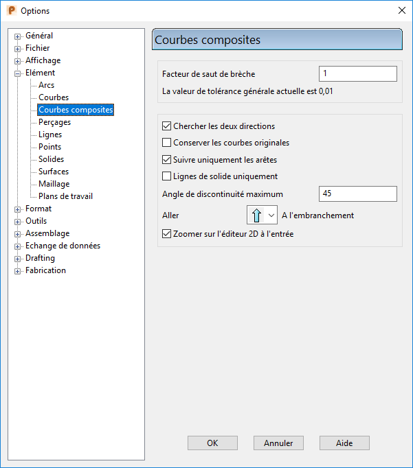 - Facteur de saut de brèche — Définissez la brèche utilisée pour rechercher un parcours adapté pendant la création de courbe composite. Le nombre est un multiple de la tolérance générale et peut être changé pendant la création d'une courbe composite. Pour vous faciliter la tâche, la valeur actuelle de la tolérance générale est affichée en-dessous de cette option.