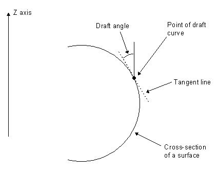 Les points de la courbe de dépouille sont déterminés le long de la surface. Les points sont pris a des positions sur la surface où la tangente fait des angle de dépouille avec l'axe normale au plan principal, comme montré ci-dessous :