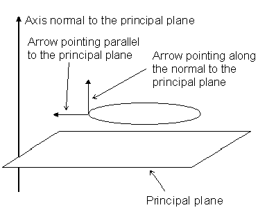 Avec Normale au plan principal sélectionné dans les options Mesurer l'angle depuis, une flèche est parallèle au plan principal et l'autre à l'axe normal au plan principal (voir ci-dessous).