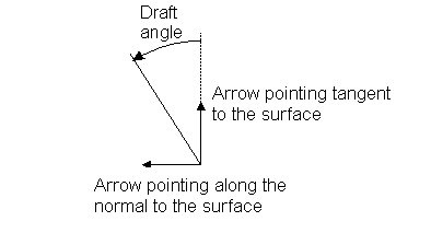 Si la courbe composite est créée à partir de la surface sous-jacente, vous pouvez utiliser les données de tangente de la surface pour définir l'angle de dépouille. Pour utiliser les données de tangente, sélectionnez Tangente à la surface sous-jacente dans les options Mesurer l'angle depuis. Les flèches changent de direction de sorte que :