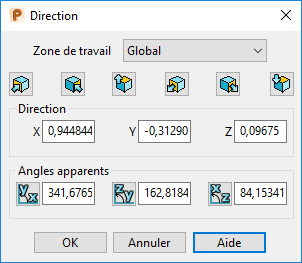 Editez la direction de l'élément sélectionné en utilisant la boite de dialogue Direction. Une direction est définie par rapport à un vecteur unitaire.