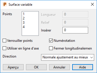 Aperçu — Ceci affiche la surface en utilisant les paramètres donnés. Si la surface résultante n'est pas correcte, changer les paramètres et cliquer à nouveau sur Aperçu. L'instrumentation au point 1 peut être utilisée pour inverser la direction du relief.
