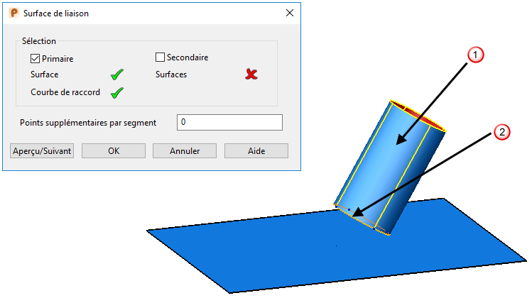 Remarque : Sans point supplémentaire par segment, la surface de liaison est créée à la tolérance et des points supplémentaires peuvent être ajoutés. Si vous spécifiez une valeur autre que zéro, vous restreignez le nombre de points par segment à cette valeur et la surface de liaison peut ne pas être à la tolérance.
