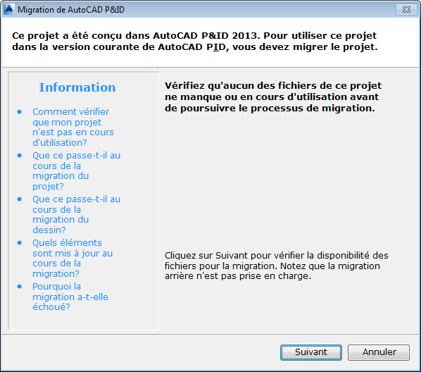 Permet de vérifier qu'un projet convient pour la migration à partir d'une version antérieure d'AutoCAD P&ID vers AutoCAD Plant 3D.