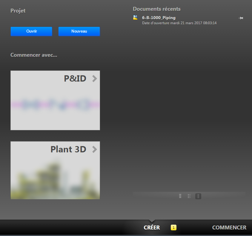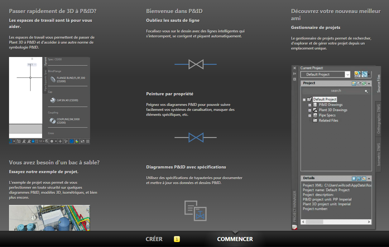 Onglets Créer et Mise en route – Ces sections ont été mises à jour de manière à inclure les sélections des espaces de travail Plant 3D et PID avec des informations propres à chacun d'eux.