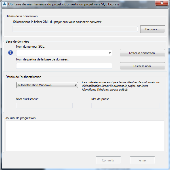 - Ces champs ne sont actifs que si l'option Authentification SQL Server est sélectionnée. Entrez vos nom d'utilisateur et mot de passe SQL Server pour continuer.