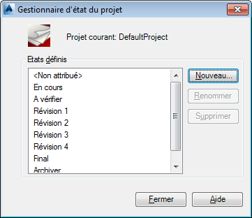 Répertorie les états qui ont été définis pour le projet en cours. Vous pouvez ajouter, renommer et supprimer des états dans la liste de cette boîte de dialogue. La liste par défaut comporte les états suivants :