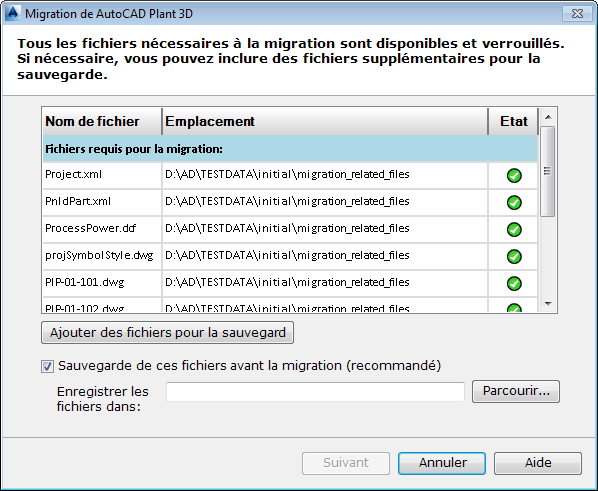Le système recherche tous les fichiers nécessaires à la réussite de la migration du projet AutoCAD P&ID 2009. Le tableau affiche de façon dynamique le nom, le chemin d'accès et l'état de chaque fichier.
